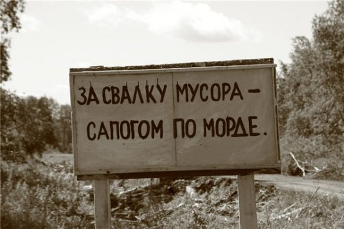 Иногда простые просьбы и предупреждения не действуют на людей. И тогда вместо культурных объявлений появляются вывески с нечеловеческой бранью и различными угрозами.