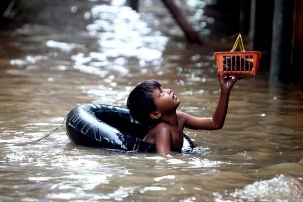 Мальчик спасает своего котенка во время наводнения.