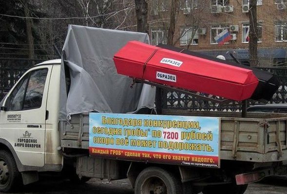 Бухать в лимузине за 1500 рублей.Что эти рекламодатели офигели? Да за эти деньги я в любом кафе побухать могу.А помидоры, подешевели на пять копеек, одолжение какое сделали.Так пусть себе в одно место эти пять копеек засунут.Ну а гробами они видимо хотят сказать:«помирай сегодня, а-то завтра будет дороже».Это получается, как на работе я своему начальнику как-то на банкете сказал, что его так уважаю и ценю, что когда он умрёт, то я ему гроб полированный из красного дерева куплю.