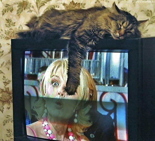 ОТЛИЧНЫЕ ФОТКИ, ЮЛЯ!!! Хорошо кот зацепил героиню фильма ПО ГЛАЗУ ЧЕРЕЗ ЭКРАН КИНЕСКОПА ТЕЛЕВИЗОРА…