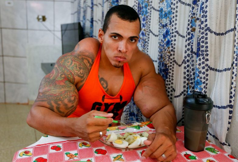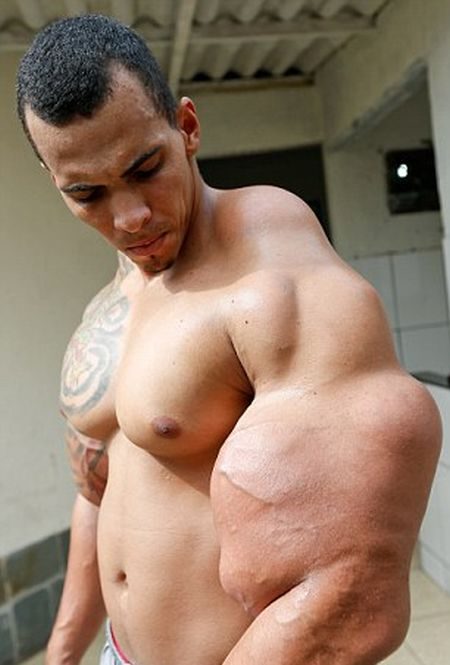 25-летний бразилец Ромарио Дос Сантос Алвеш стал похожим на монстра Халка. Рискуя жизнью он делал инъекции синтола в мышцы рук, которые ему едва не ампутировали. На данный момент у бодибилдера большие проблемы со здоровьем.