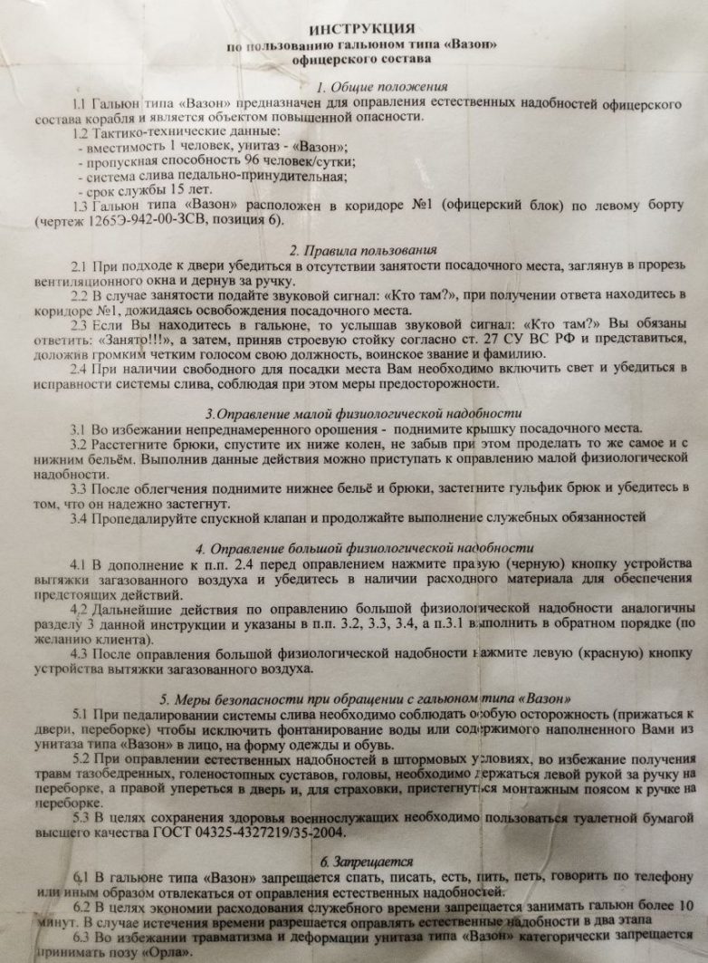 Объяснительная и последняя инструкция по гальюну — просто народные шедевры. И вообще всё здОрово, особенно дискриминация по туалетной бумаге!