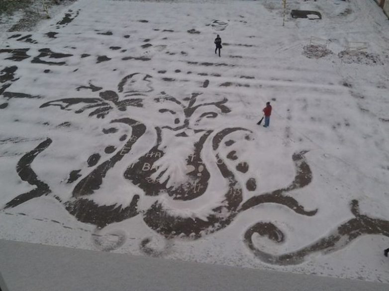 Идея творить на снегу пришла спонтанно — надоумили школьники. Они же и стали благодарными зрителями. Семен Бухарин не рвется к славе. Говорит, это все для детей. Школота в ответ называет его великим художником.