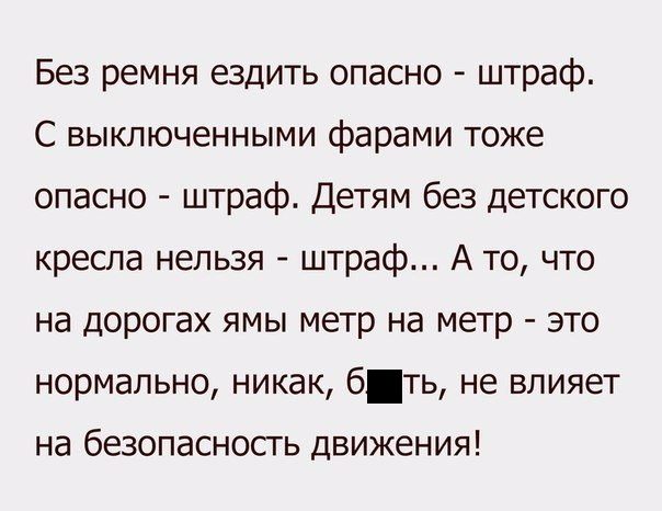По моему не смеяться а плакать надо, а про штрафы они по моему не для безопасности движения вводятся а для выкачивания из нас денег всеми правдами и не правдами. Так же как и повышение тарифов запланированое ежегодное.