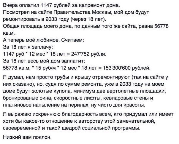 А в правительстве знают расчёт на капремонт дома? Просто ощущение, что запятая при расчётах исчезла.