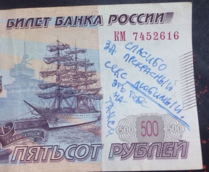 На 500 купюре, мужик написал)) ппц… гомосеки друг другу душевные записи на банкнотах делают…