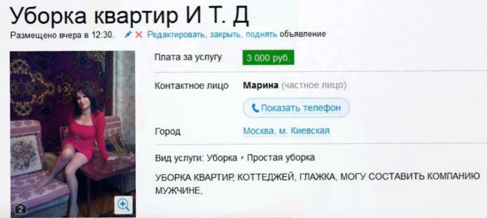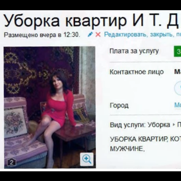 Последнее объявление из раздела «Скрытые сексуальные услуги», можно понять, что девушка после секса и порядок наведет…