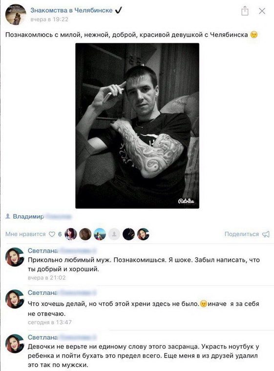 Ну, что можно сказать Светлане? Пьёт, тырит у ребёнка ноутбук, это ерунда, а вот знакомится в интернете — это верх цинизма. Похоже, вы идеальная пара, люди!!!