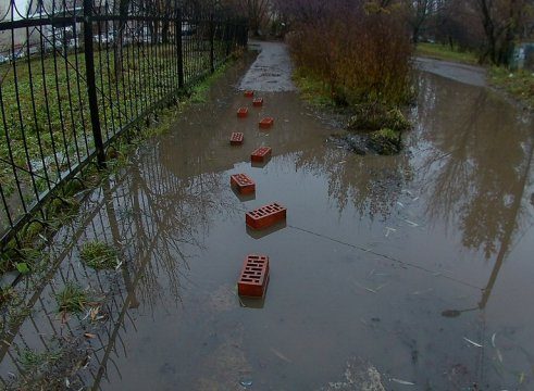 Кирпичи для прохода через лужу — это дешево и эффективно. В стране применяется повсеместно.