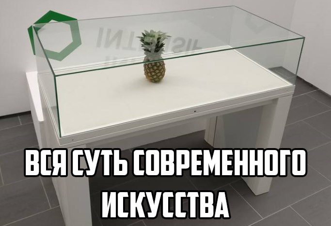 Для тех кто не в курсе с ананасом… На выставке какого-то там исскуства кто-то забыл ананас на столе, персонал подумал что это экспонат и поместил его под стеклянную витрину… Это все, что нужно знать о современном искусстве… )))