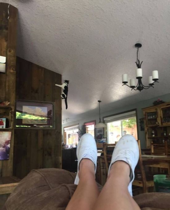Интересно… КАК коты на подвесной потолок попали? Судя по лапам он там ещё и не один…