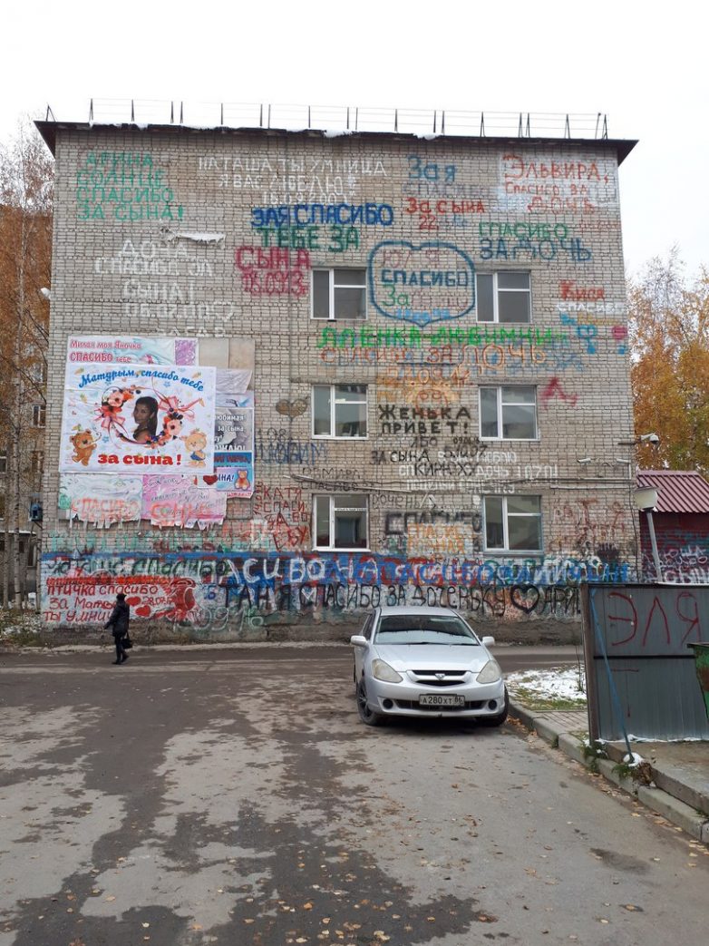 А стена с надписями, это стена Нижневартовской травмотологии, расположена на против роддома. Я, да и все, кто рожал в нашем роддоме, читая надписи всегда удивлялись, каким образом их там пишут? Неужто кран пригоняют. Да и сами надписи, порой загоняют в тупик.