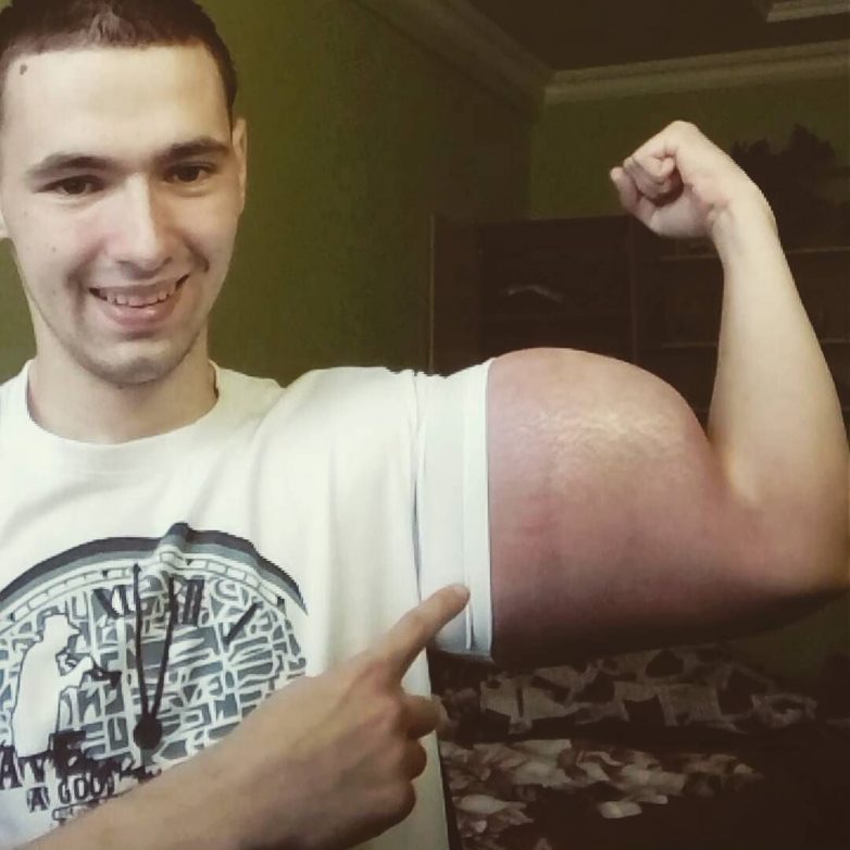 Знакомьтесь, это 21-летний Кирилл Терешин из Пятигорска. Его 64-сантиметровые бицепсы являются не результатом изнуряющих многочасовых тренировок и белкового питания, а следствием инъекций масла, известного как синтол.