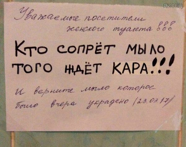 что примечательно, в женском туалете всегда грязнее, чем в мужском. Средства личной гигиены куда только фантазия не подсказывает распихать, только не в мусорный бачок. Свёрнутые краны, разбитые раковины… что они там делают???