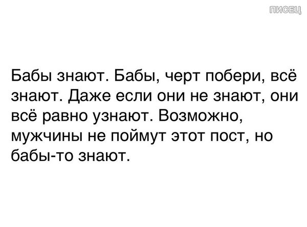 А бабы-то зна-ают! :)) И зачастую им плевать на мнение бродячих собак и феминисток-всё равно выскажут своё! :))