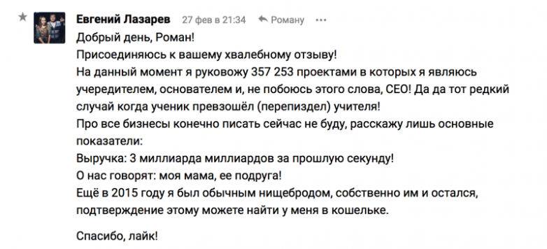 Александр Кузнецов напрасно это написал, его девушка сразу решит, что именно так и выглядит. Теперь Сашку нигде не спрятаться, ни в чужом городе, ни в чужой стране, ни под чужой фамилией. Беги, Саша, беги!