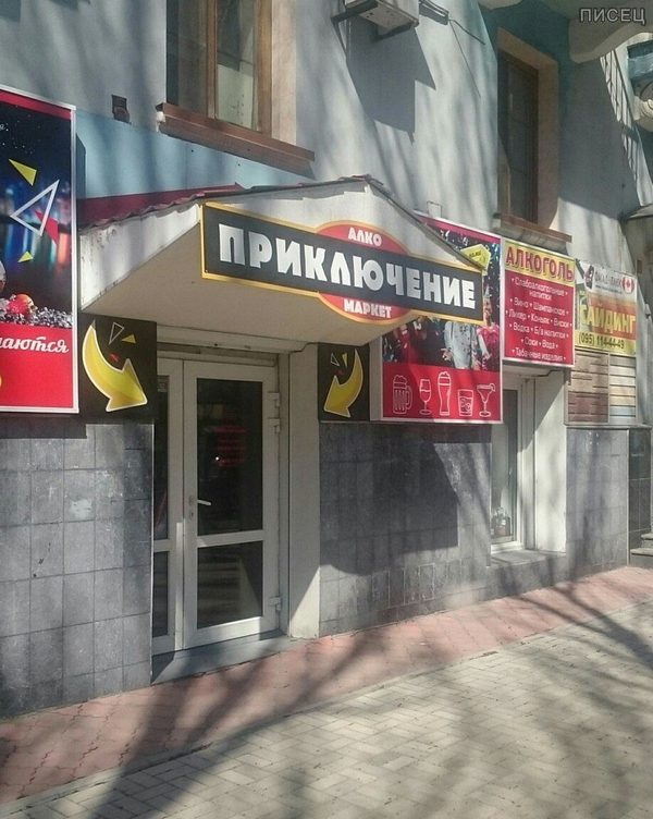 Чучело фотошоповое на первом снимке… А вот, алкомаркет «ПРИКЛЮЧЕНИЕ» — вероятно «на свою жопу» ..!