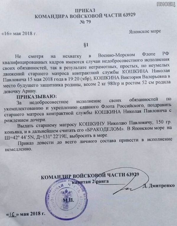 Да фик с ним, с коньяком… но безграмотность этого «приказа» просто зашкаливающая! Будь я Кошкиным — автора этого произведения утопил бы без малейшей жалости.