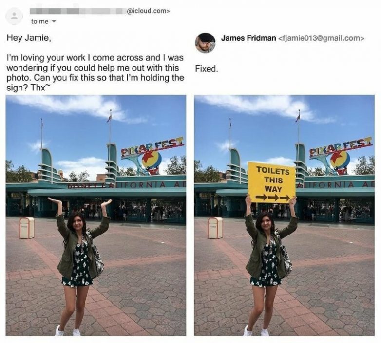 Напомню, этого главного фотошоп-тролля в мире зовут Джеймс Фридман. Ему ежедневно присылают фотографии для коррекции, с пожеланиями что и как сделать. Джеймс выполняет в точности как просит заказчик, и в итоге получаются вот такие шедевры…