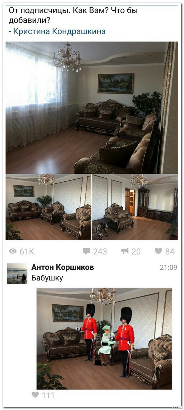 Ну а чё? Раз ты такой крутой дизайнер-то, что впихиваешь такую мебель в крохотную комнату с низкими потолками, то тогда бабушку, котов и фак. Хоть креативно будет…
