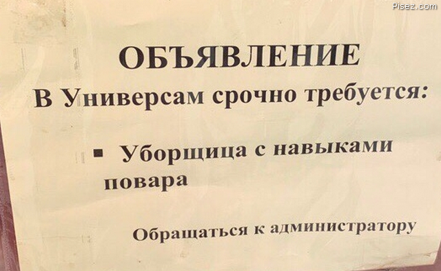 Уборщица с навыками повара,- это которая «по амбарам помела, по сусекам поскребла, — и испекла»))