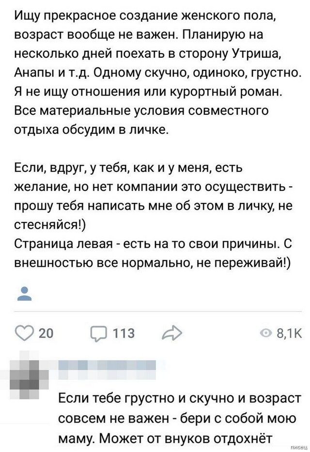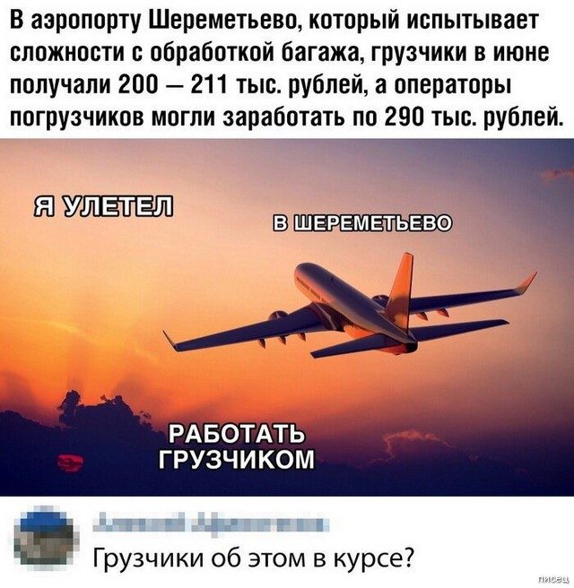 Теперь на сайтах знакомств появится: «Ищу свою половинку. Рост, вес, внешность и образование не имеют никакого значения. Главное, чтобы был грузчиком в Шереметьево!»))))))