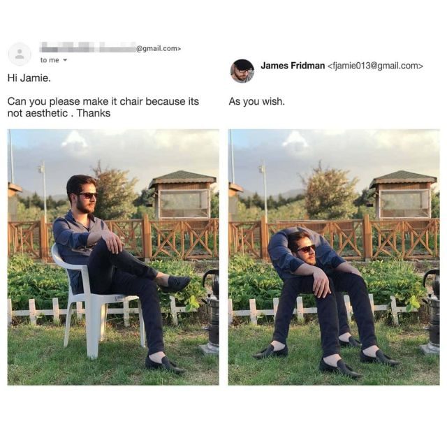 Напомню, этого главного фотошоп-тролля в мире зовут Джеймс Фридман. Ему ежедневно присылают фотографии для коррекции, с пожеланиями что и как сделать. Джеймс выполняет в точности как просит заказчик, и в итоге получаются вот такие шедевры…