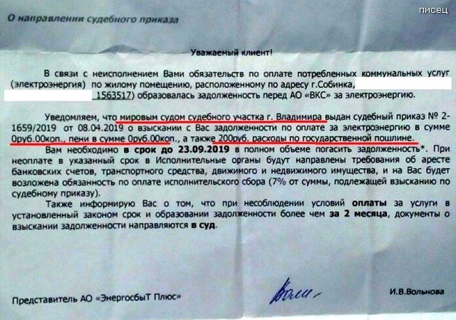 •Судебный приказ, бл♥дь, за то, что нет задолженности ))) Поэтому с тебя 200 р. по госпошлине, с*ка )))