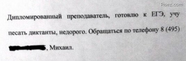 Надь, а там ещё объявление, что какой-то преподаватель, шибко дипломированный, к ЕГЭ готовит, ПЕСАТЬ учит ...!