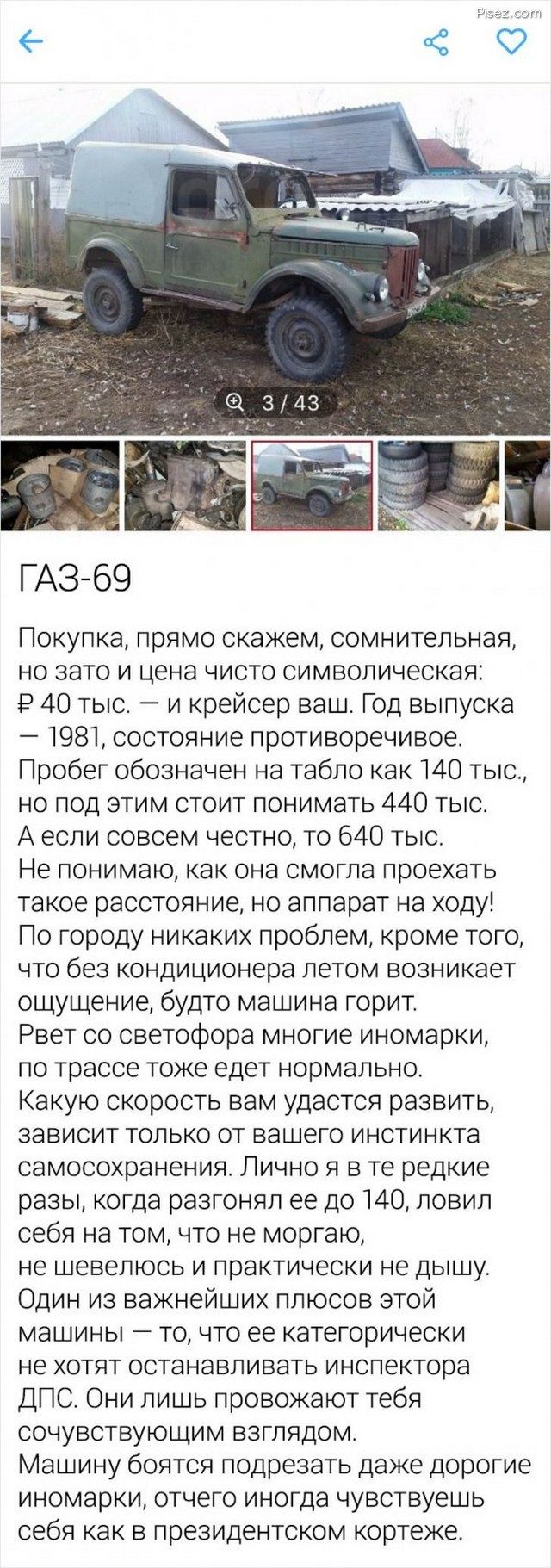 Беру!!! Крутяк!!! а права надо? а она крашеная? а она не битая? а хозяев сколько было? а на Авито и по факту совпадает? а бензин советский или современный? а покрышки родные? ;););)