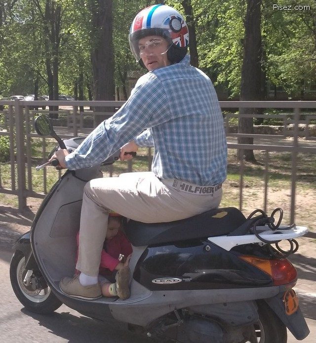 ну что б так особо не арали-вот вам 12 фото сверху… что мы видим-взрослый мужик оборачивается в шлеме а под ногами у него ребенок… так вот нет там никакого ребенка… ну или посмотрите плече правое ребенка слишком длинное для ребенка-а по сему -монтаж… и там много несоответствий сразу не заметишь.