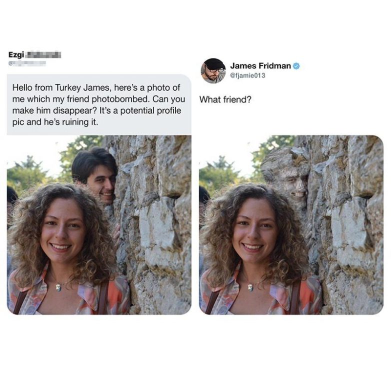Джеймс использовал свои навыки графического дизайна, чтобы помочь другу этой женщины незаметно исчезнуть на заднем плане — молодой человек просто взял и слился с окружающей средой