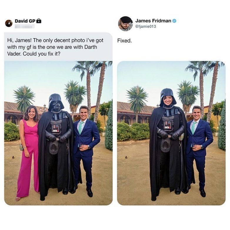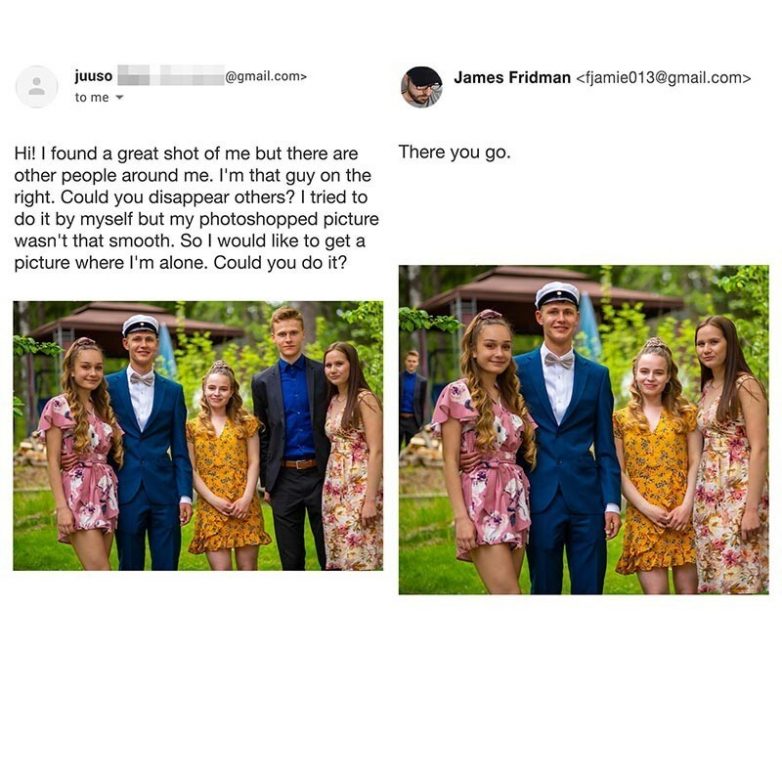 Одна пара захотела изменить свою свадебную фотографию и убрать шест, портящий, как им казалось, снимок, и Джеймс услужливо согласился это сделать
