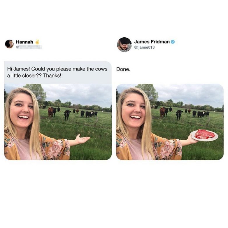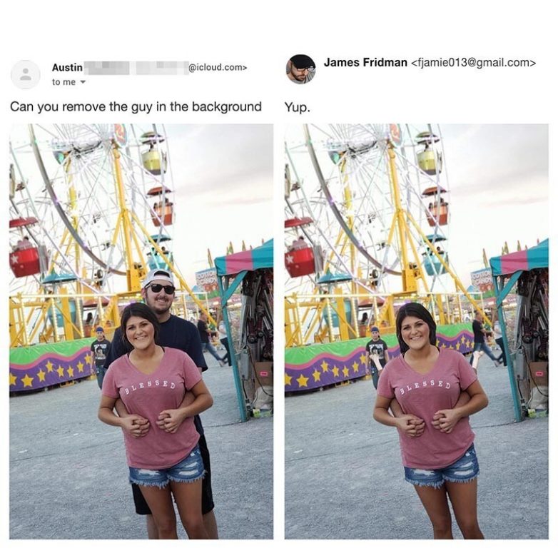 Напомню, этого главного фотошоп-тролля в мире зовут Джеймс Фридман. Ему ежедневно присылают фотографии для коррекции, с пожеланиями что и как сделать. Джеймс выполняет в точности как просит заказчик, и в итоге получаются вот такие шедевры…