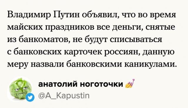 Владимир Путин по просьбе Роспотребнадзора сделал 10 выходных дней в мае. И вроде бы отличная новость, но интернет-приколисты оказались этому недовольны, и вот, что они насочиняли…