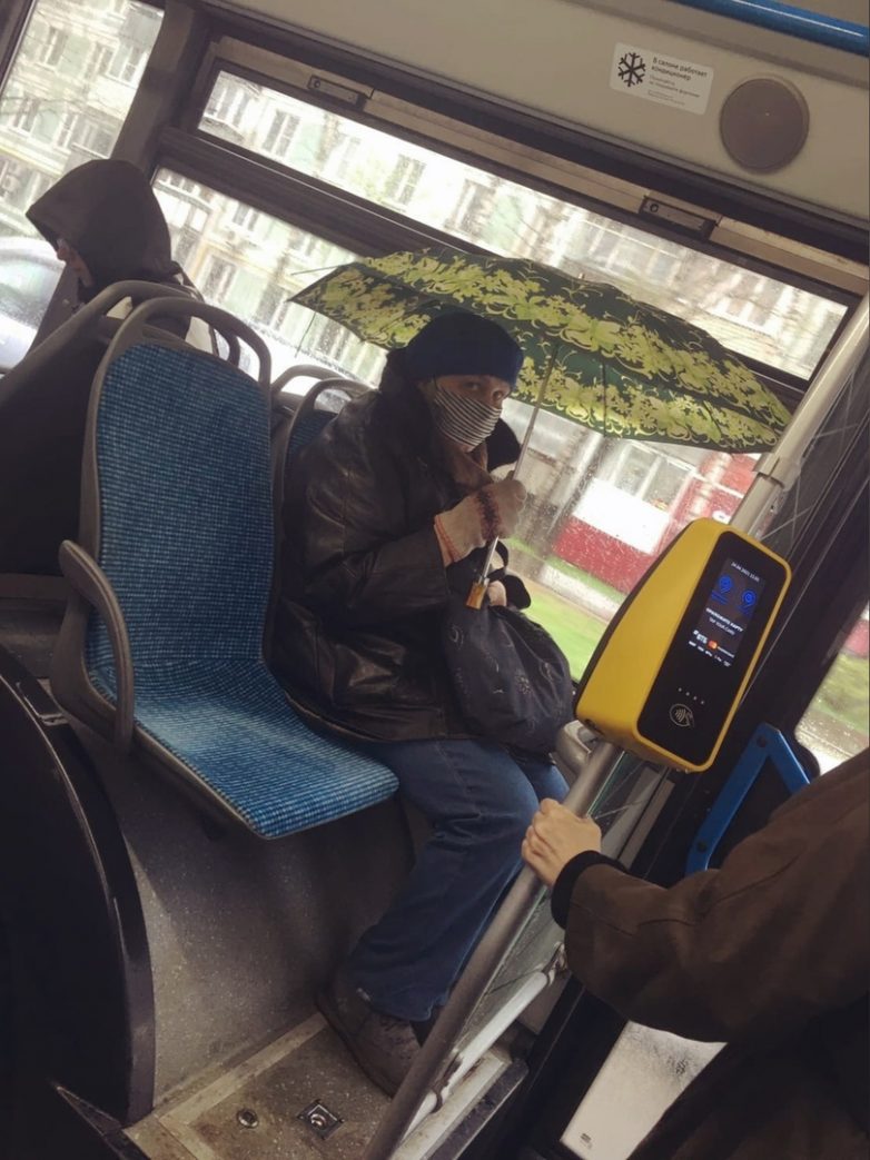 В наших автобусах и маршрутках на сиденья у окна очень часто капает, — так что тётя очень мудро под зонтиком сидит