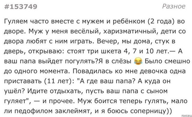 Про детей, девочку и папу — который с детьми играет. мы в саду калитку не заперли, так к нам пришла девочка лет пяти. «Я к вам в гости». Увидела блины на столе:«А у вас варенье есть?». Облазила весь домик, на второй этаж тоже. Потискала наших кошек. И ничего — родители не особо беспокоятся. И так не раз приходила. В этом году стала старше — просто мимо проходя здоровается, но уже не заходит.