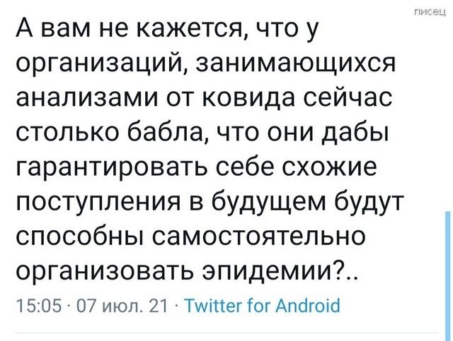 Бесит только одно. Устроили цирк и нас заставляют в нём участвовать. Развлекались бы сами, без нас. Собрались бы в своём ООНе и давай причитать по поводу померших от прививок, ковида и маминого xpена! И сами себя на изоляцию-вакцинацию…