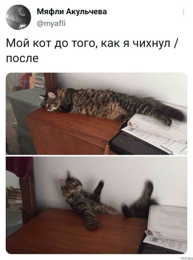 Реакция кота на чих бесподобна!
