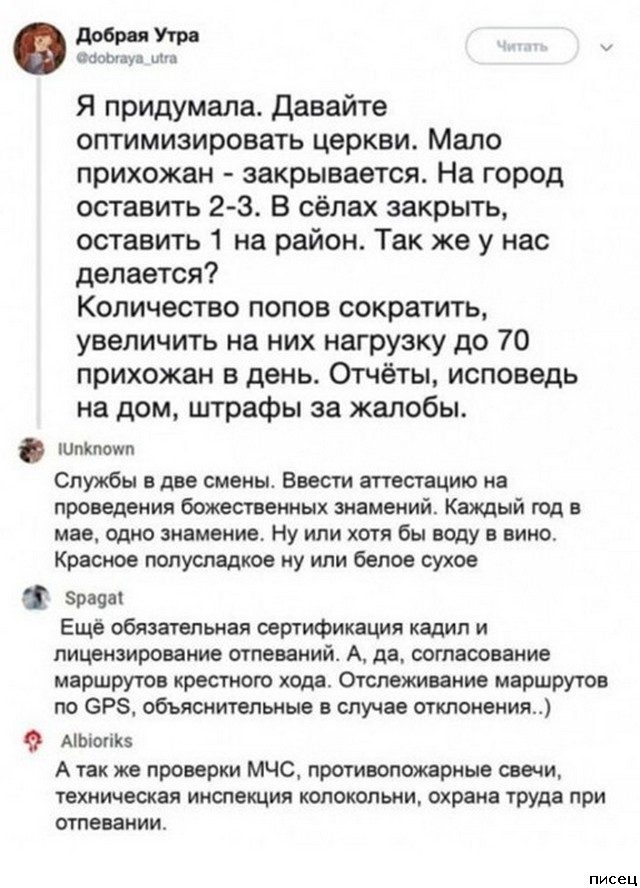 Посту про церкви уже больше двух лет, в разгар ковида уже все прошутились, про сантехника в пopнухе- больше десяти. Юль, ну хоть бы посвежее что-нибудь.