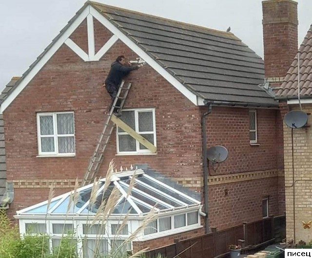 Но с фотки, где чувак на крыше водосток привязывает — мне аж поплохело!