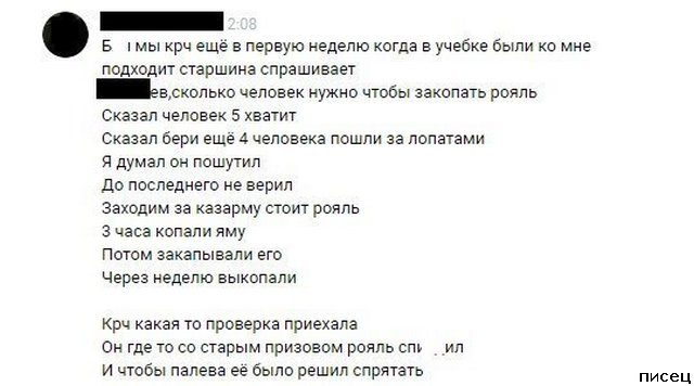 А мы форму закапывали. Прапор где-то стянул. Много было. Она в каптёрке валялась. Проверяющий приехал, мы её в кусты таскали, потом закопали. Потом выкопали, обтряхнули и опять в каптёрку свешали. Армия.))