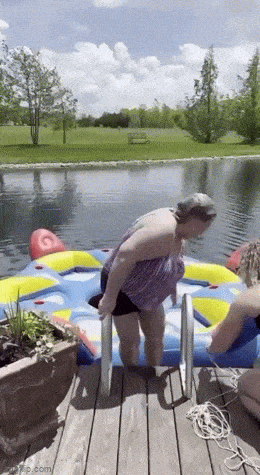 Тетка классно нырнула в надувной круг :)