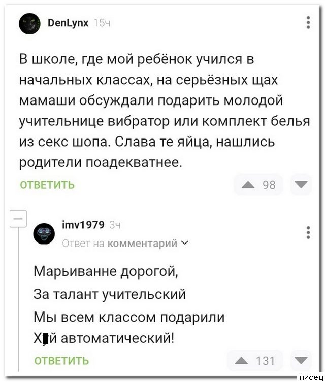 У нас в школе тоже один к о з ё л был, училке под стул н а с р а л…
