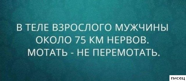 Как же быстро могут женщины вымотать 75 км (!!!)нервов, что у мужика только и остается, что залезть к ней между ног, наивно надеясь передохнуть. Потому и живут меньше (скупая слеза...). ;))