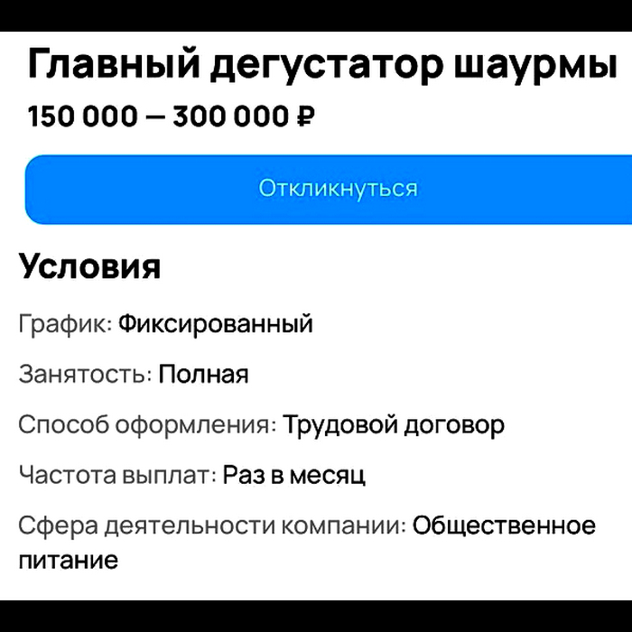 Наверное у всех есть знакомый, который никак не может найти нормальную работу и постоянно жалуется на рынок труда. Мол, все не то и все не так. Но тот, кто ищет, тот всегда найдет! Вот, например, настоящая вакансия мечты в Ростове-на-Дону. Там ищут дегустатора шаурмы! От кандидата требуется только одно: искренняя любовь к шаурме и готовность колесить по России и Казахстану ради пищи богов. И не переживайте, заботливый работодатель включил в соцпакет походы к гастроэнтерологу. И за всю эту красоту обещают платить до 300 тысяч рублей. Кайф или не кайф?