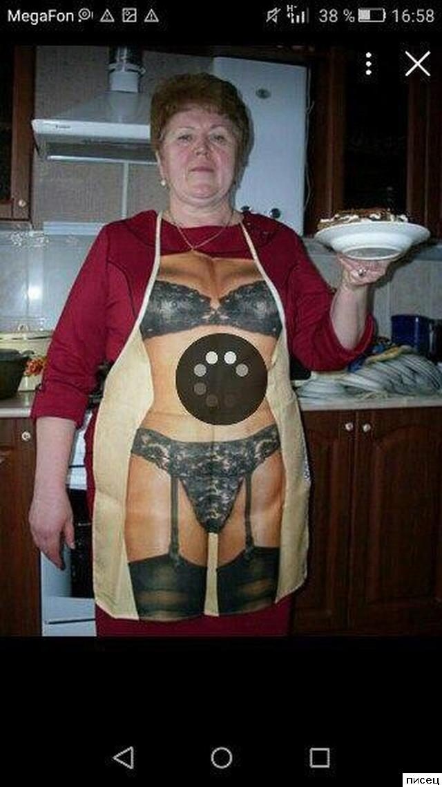 «Кенгурятник» (передник) напомнил анекдот: Командировочный (К) решил пообедать в ресторане. Официантка (О) — «На первое только суп харчо. А на второе… ну, не знаю, хоть сама на стол ложись...» К -" Первого не надо, два вторых, пожалуйста !"