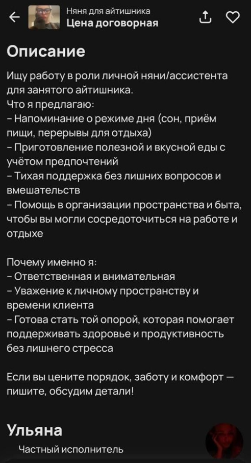 За деньги девушка обещает следить за режимом дня, напоминать о приеме пищи, помогать с готовкой, убирать квартиру и психологически поддерживать после напряжённых созвонов — чтобы программист мог полностью сосредоточиться на коде и дедлайнах.